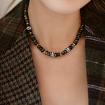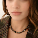 - A strand of black obsidian rondelle beads, 24k antique gold plated slices and crystal rondelle beads