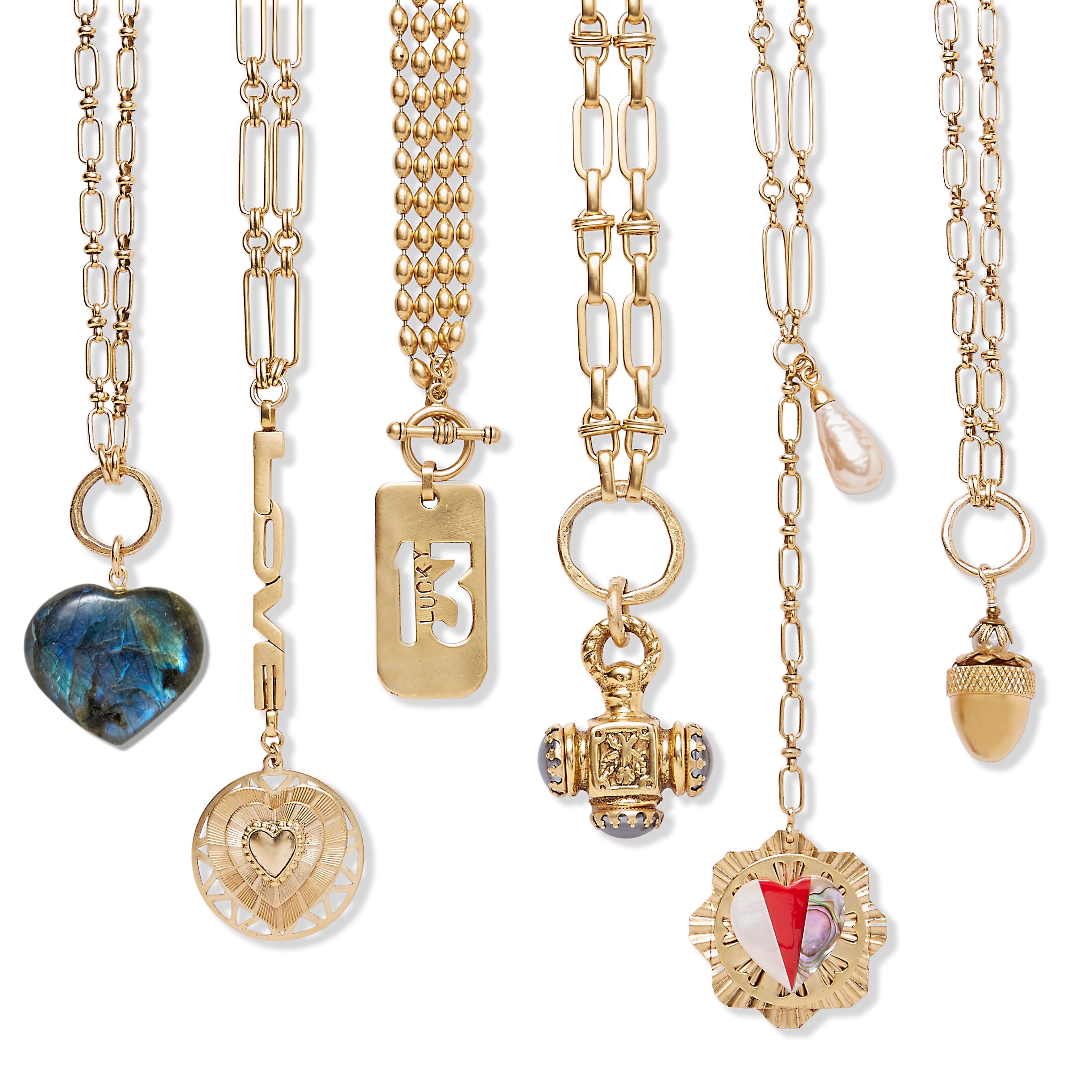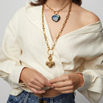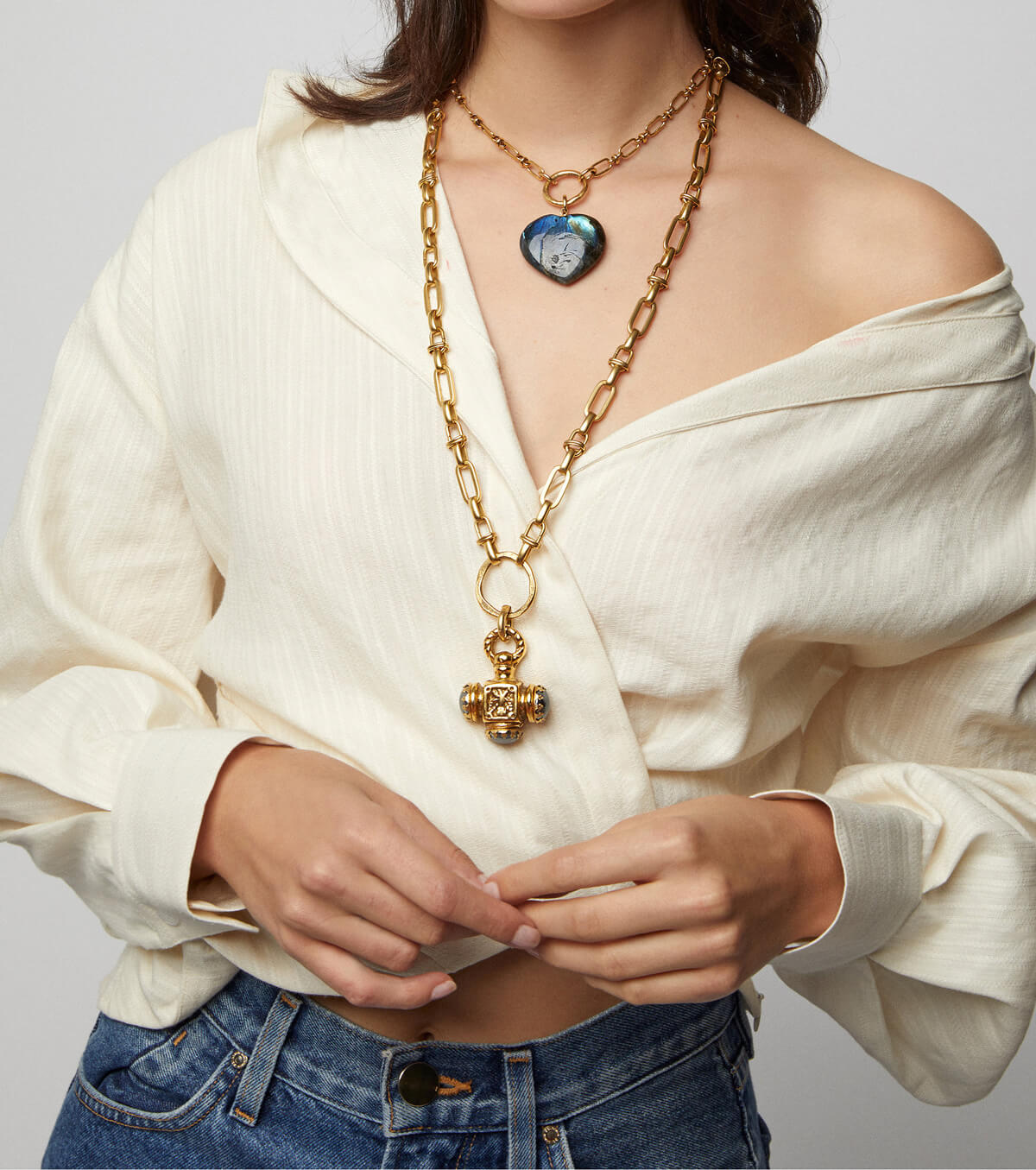- 24k antique gold plated gas key adorned with hematite hangs from 24K antique gold plated Duchess Curb Chain