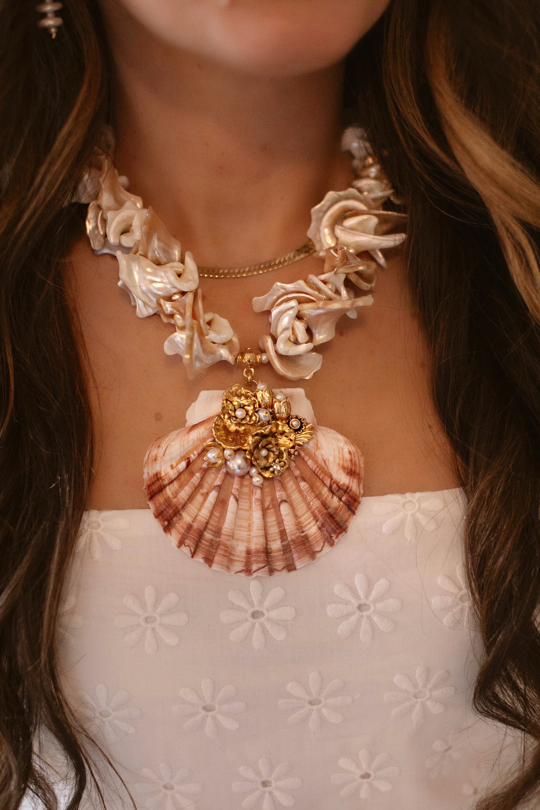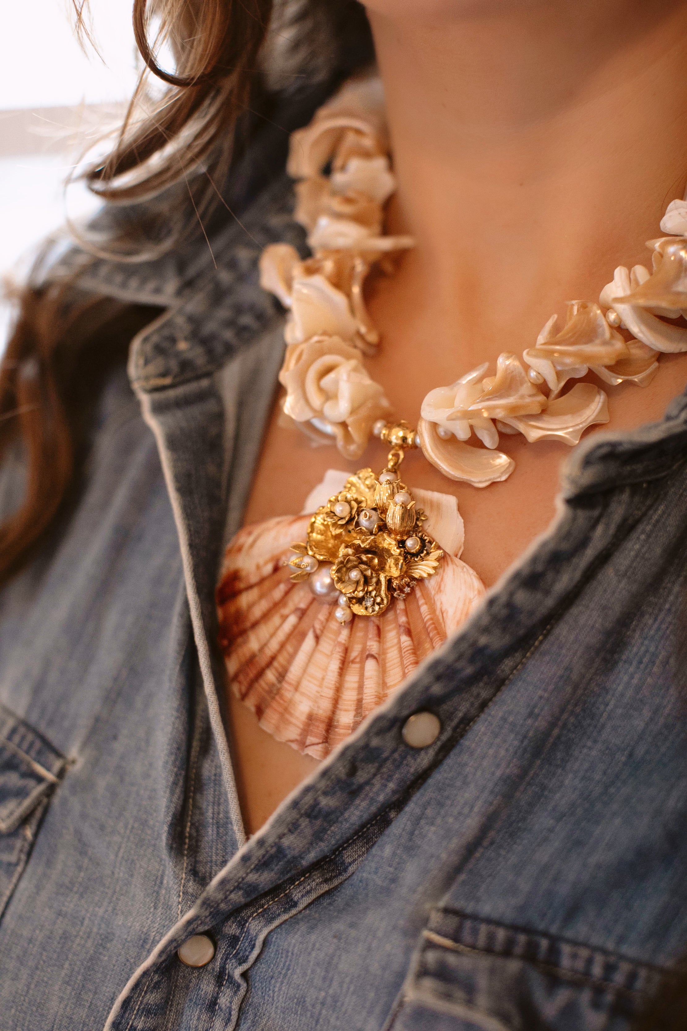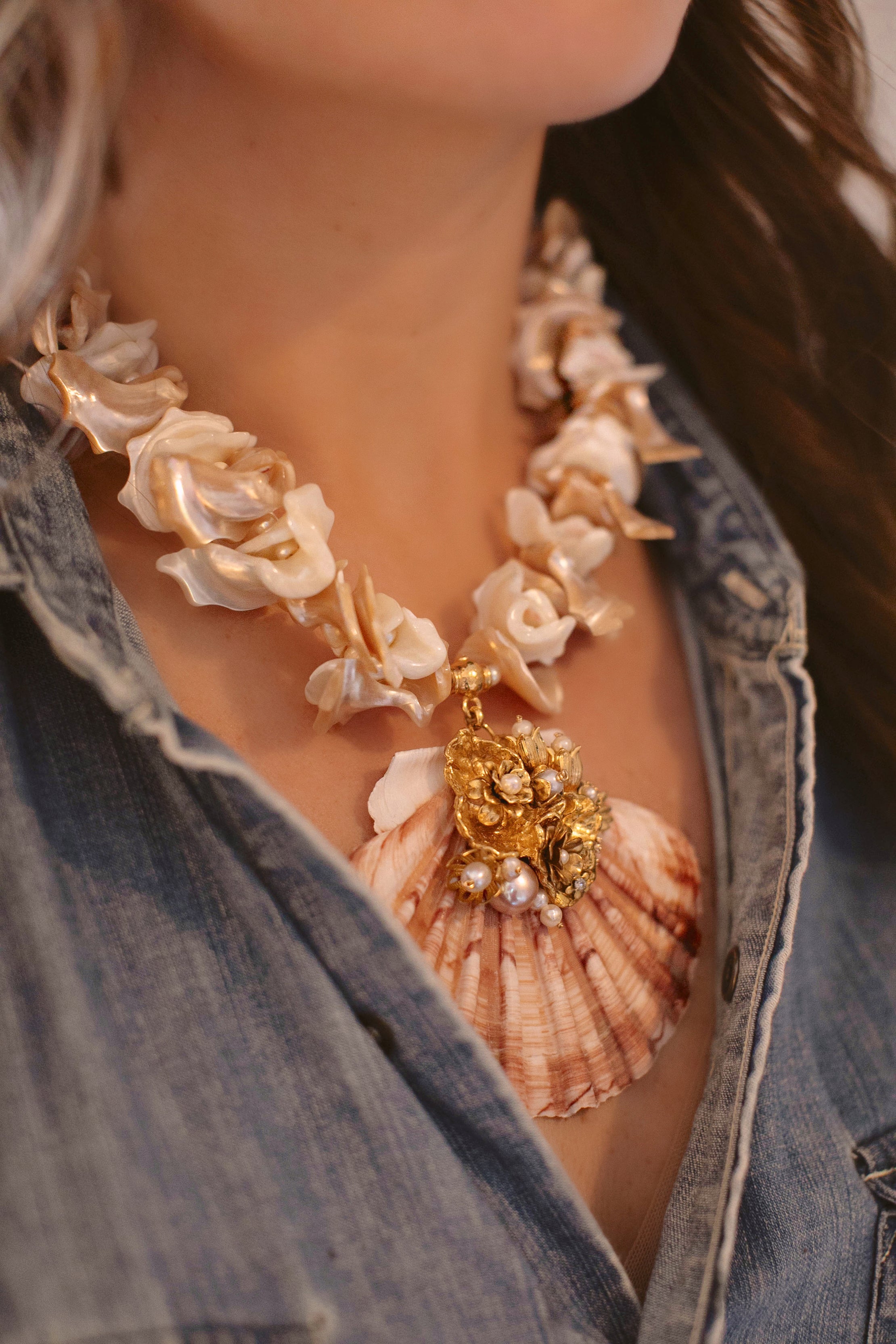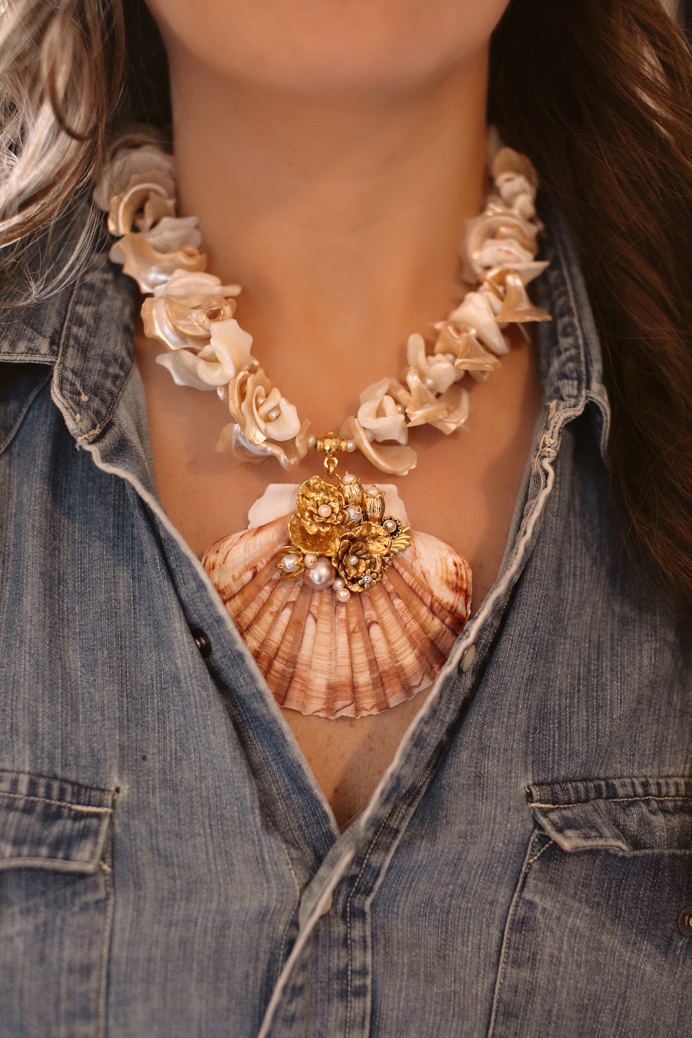 - A flat Scallop shell adorned with 24k antique gold plated flowers set with freshwater pearls hangs from a strand of frangia MOP and freshwater pearls