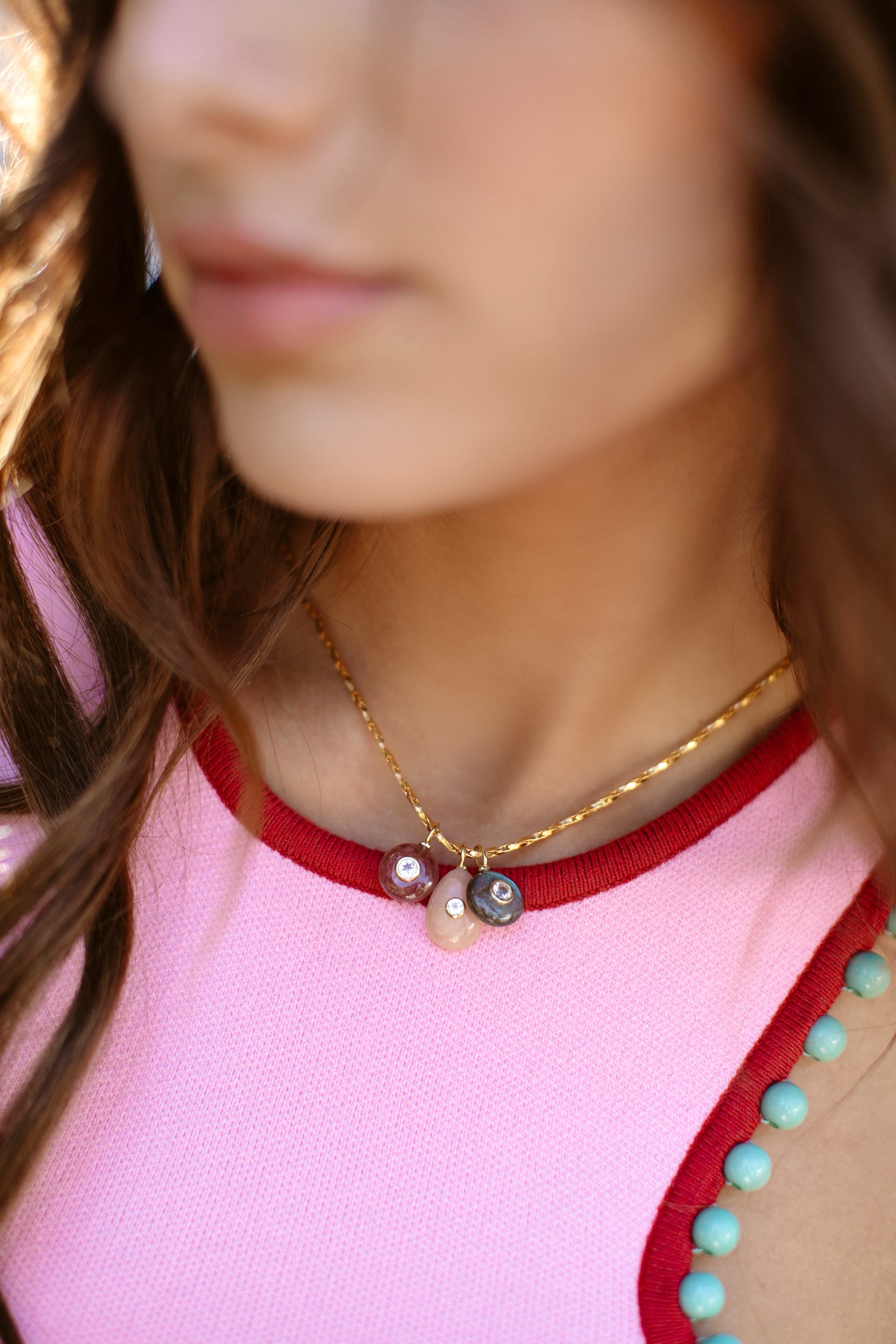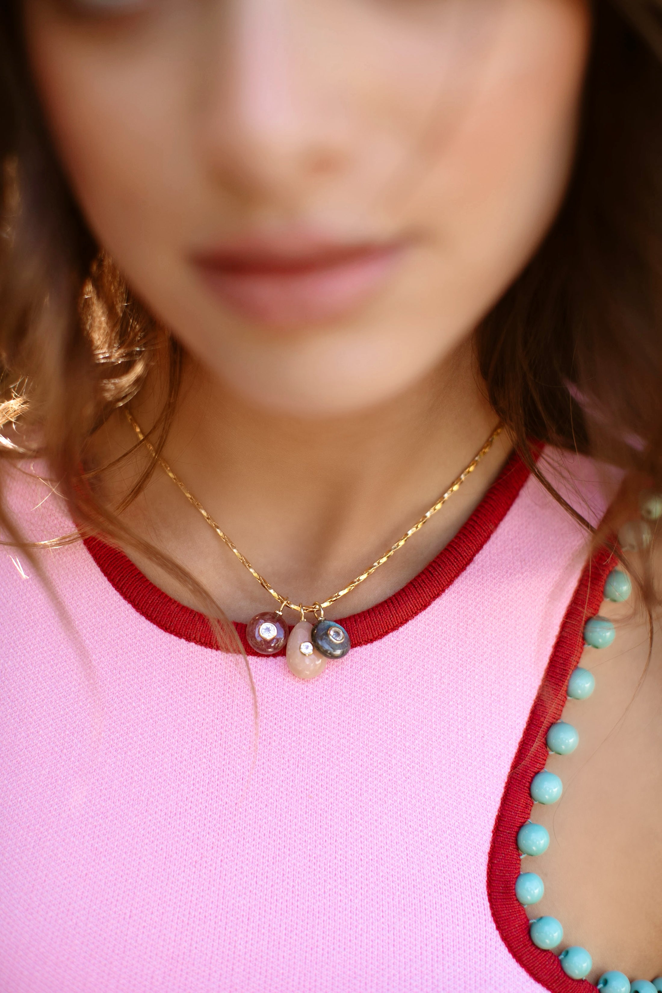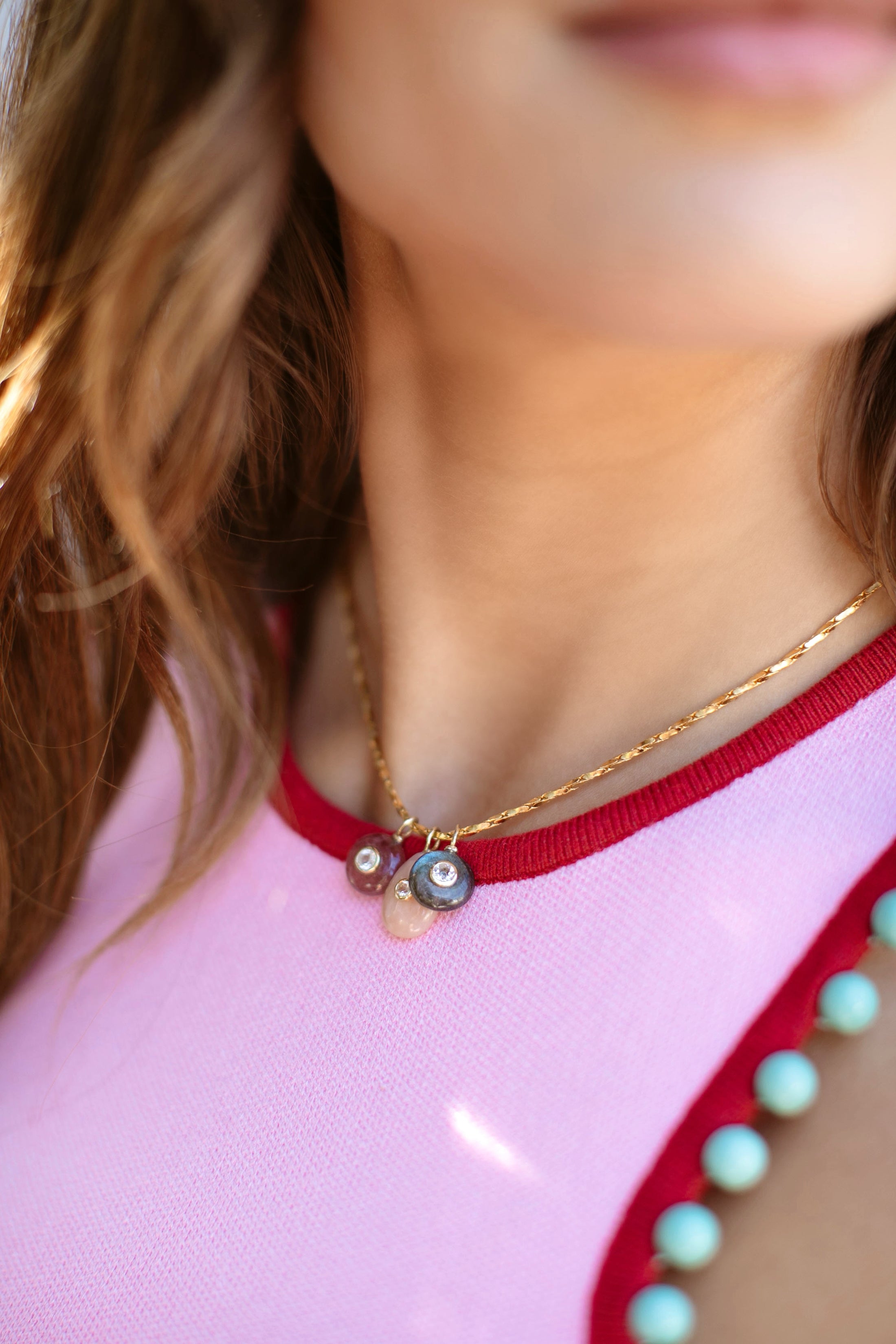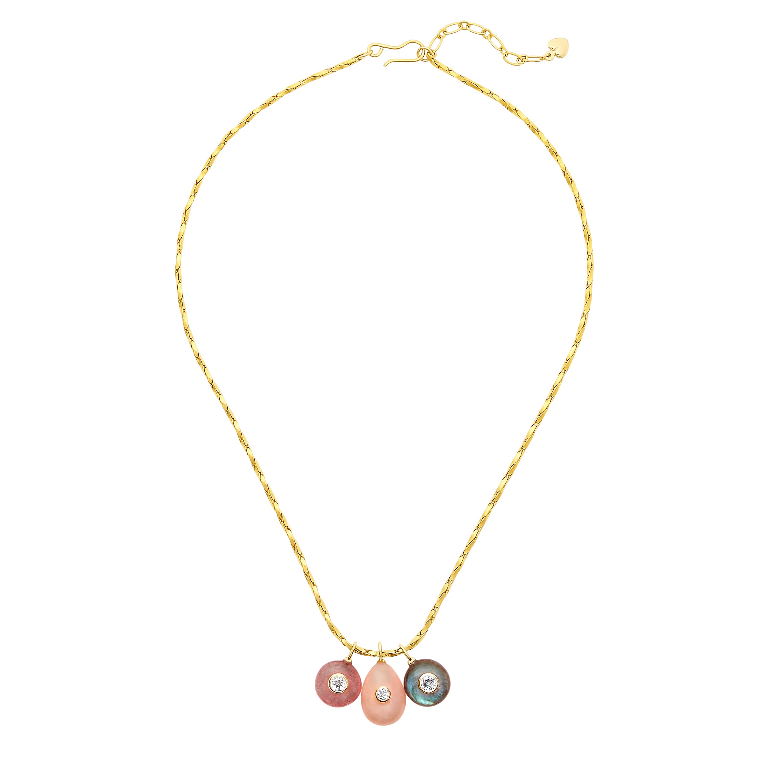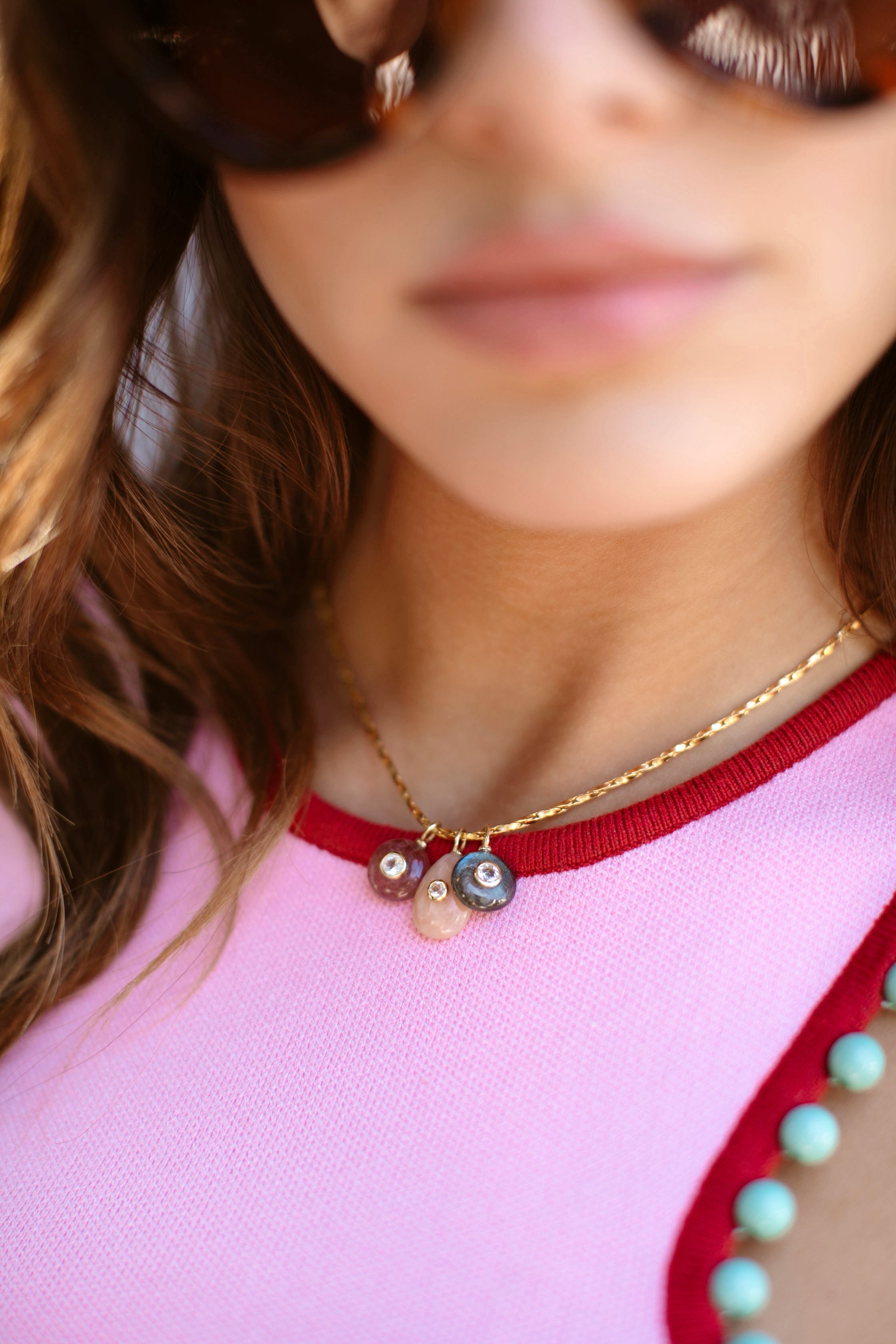 - Three semi-precious gemstone charms adorned with crystal inlay slide along a 24k antique gold plated twisted hayseed chain