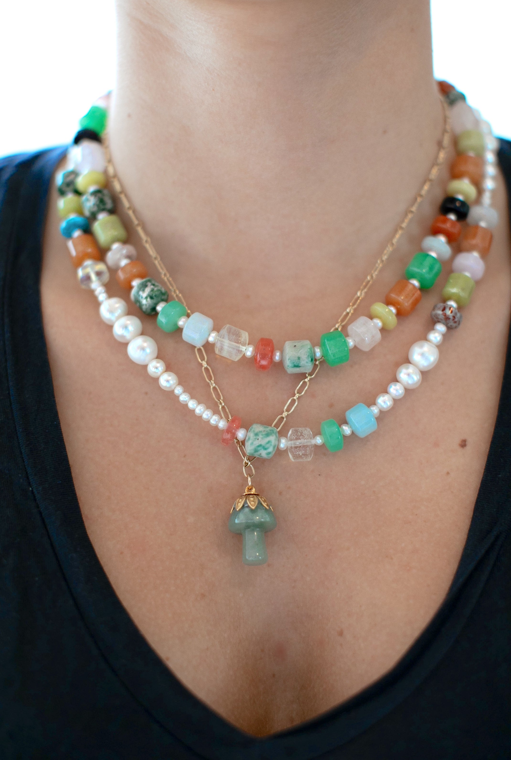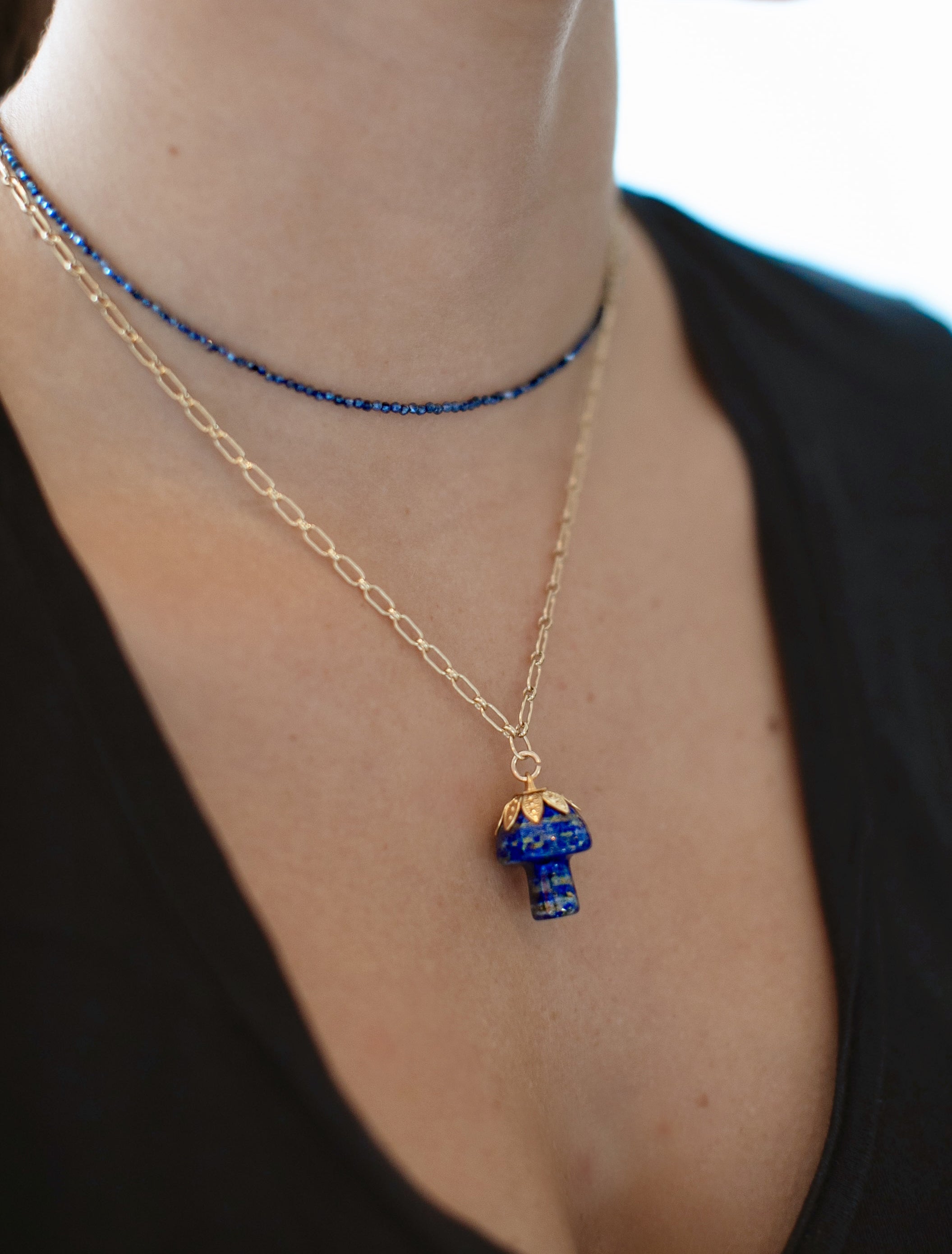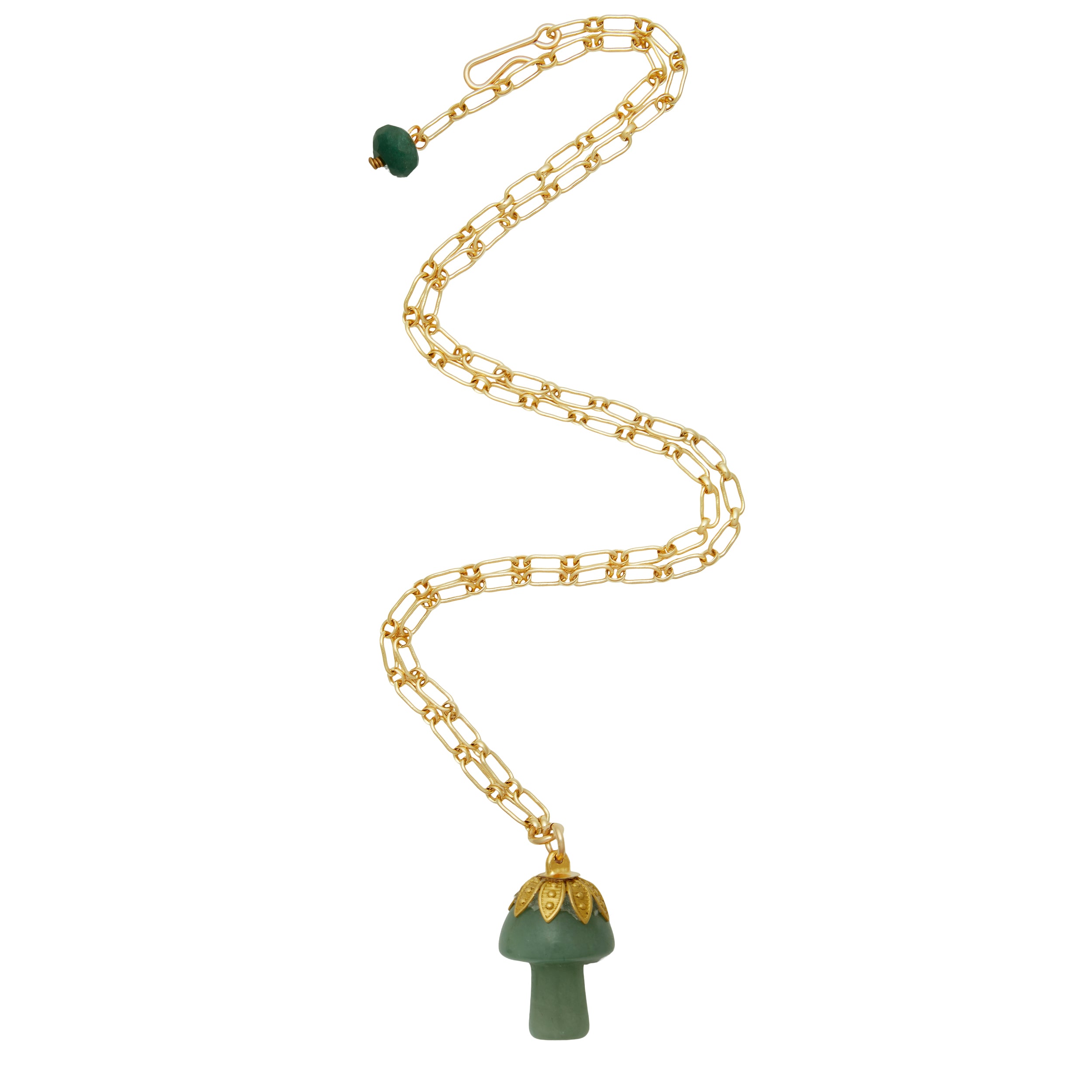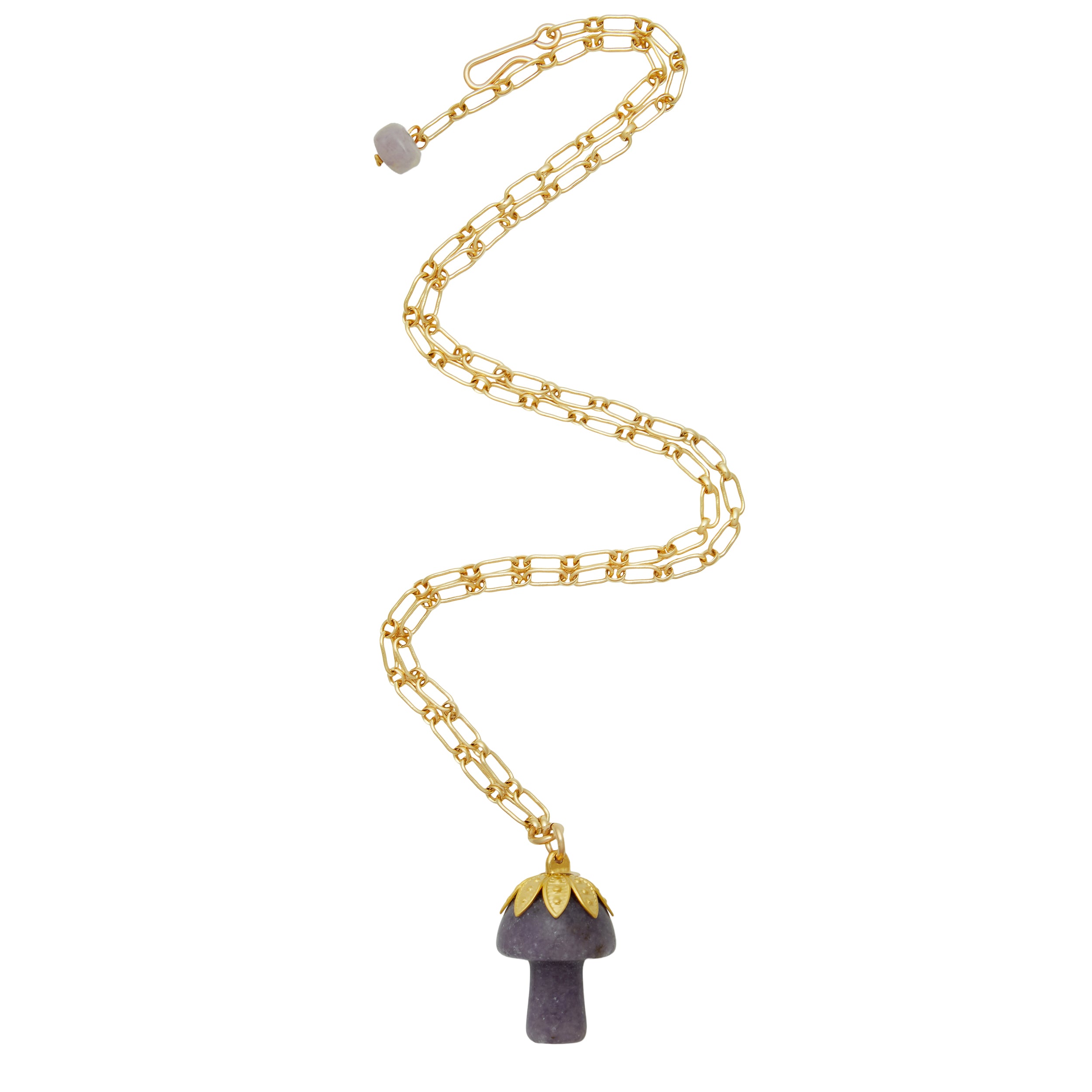 - A semi-precious stone mushroom hangs from a gold filled long & short chain
