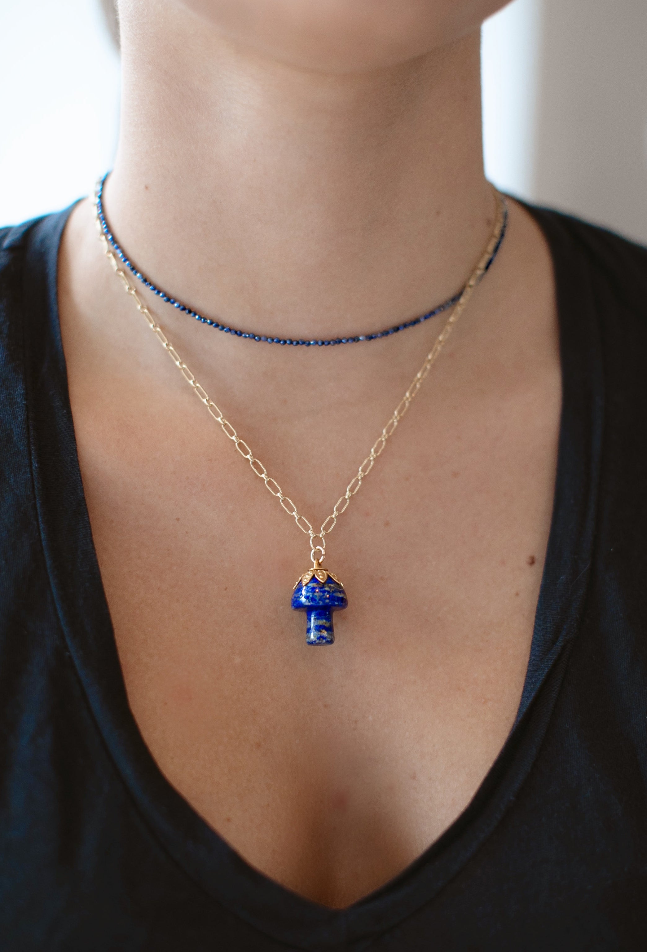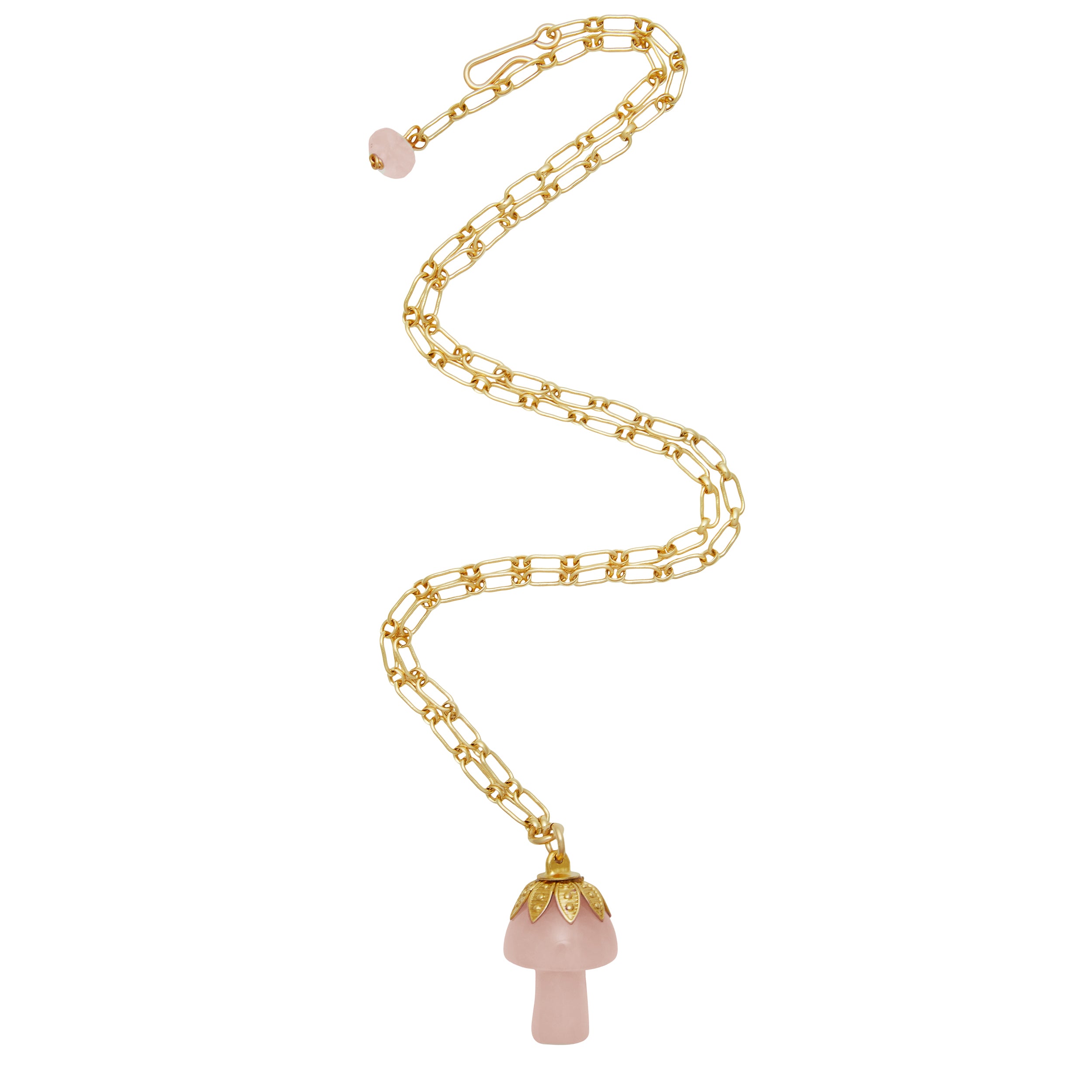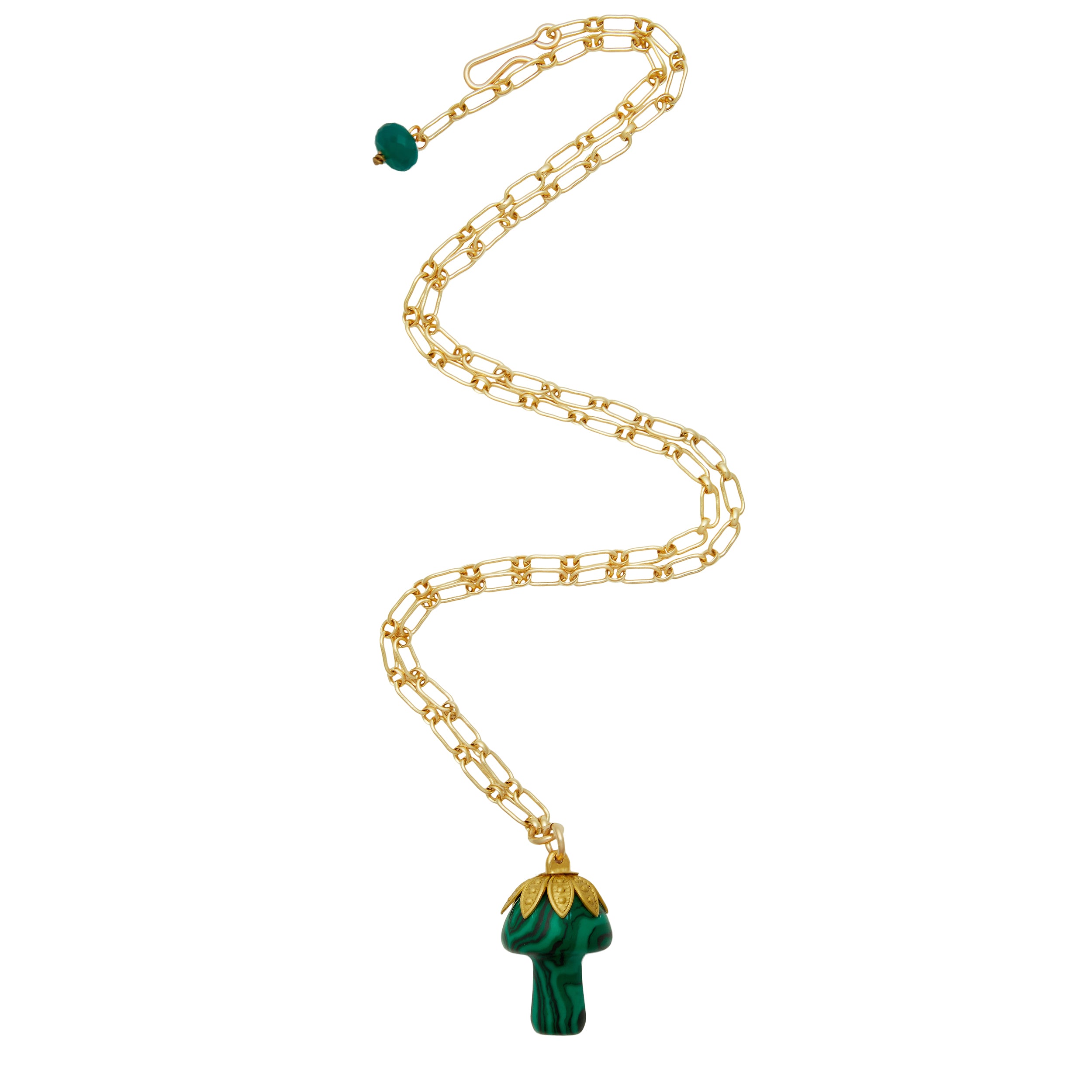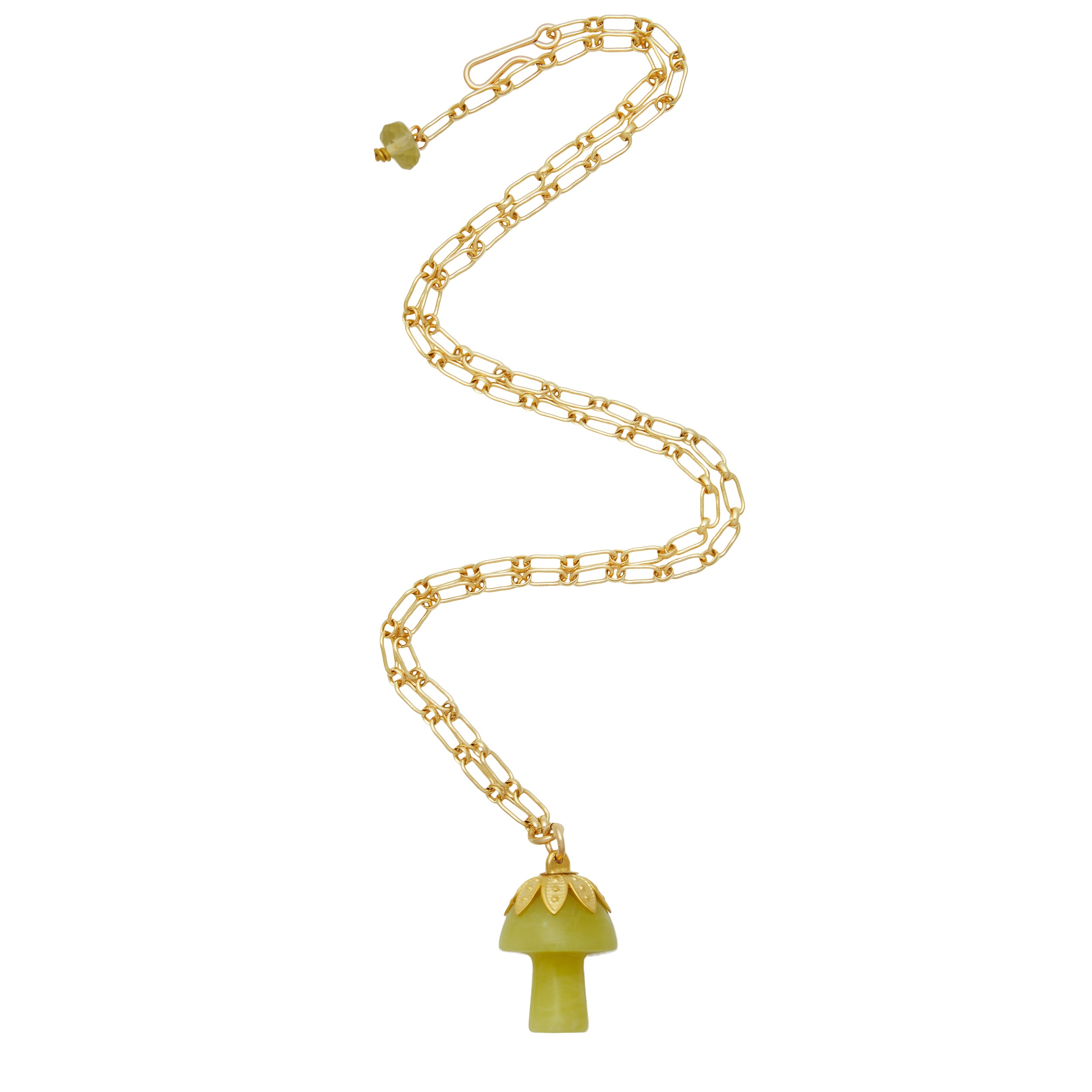 - A semi-precious stone mushroom hangs from a gold filled long & short chain