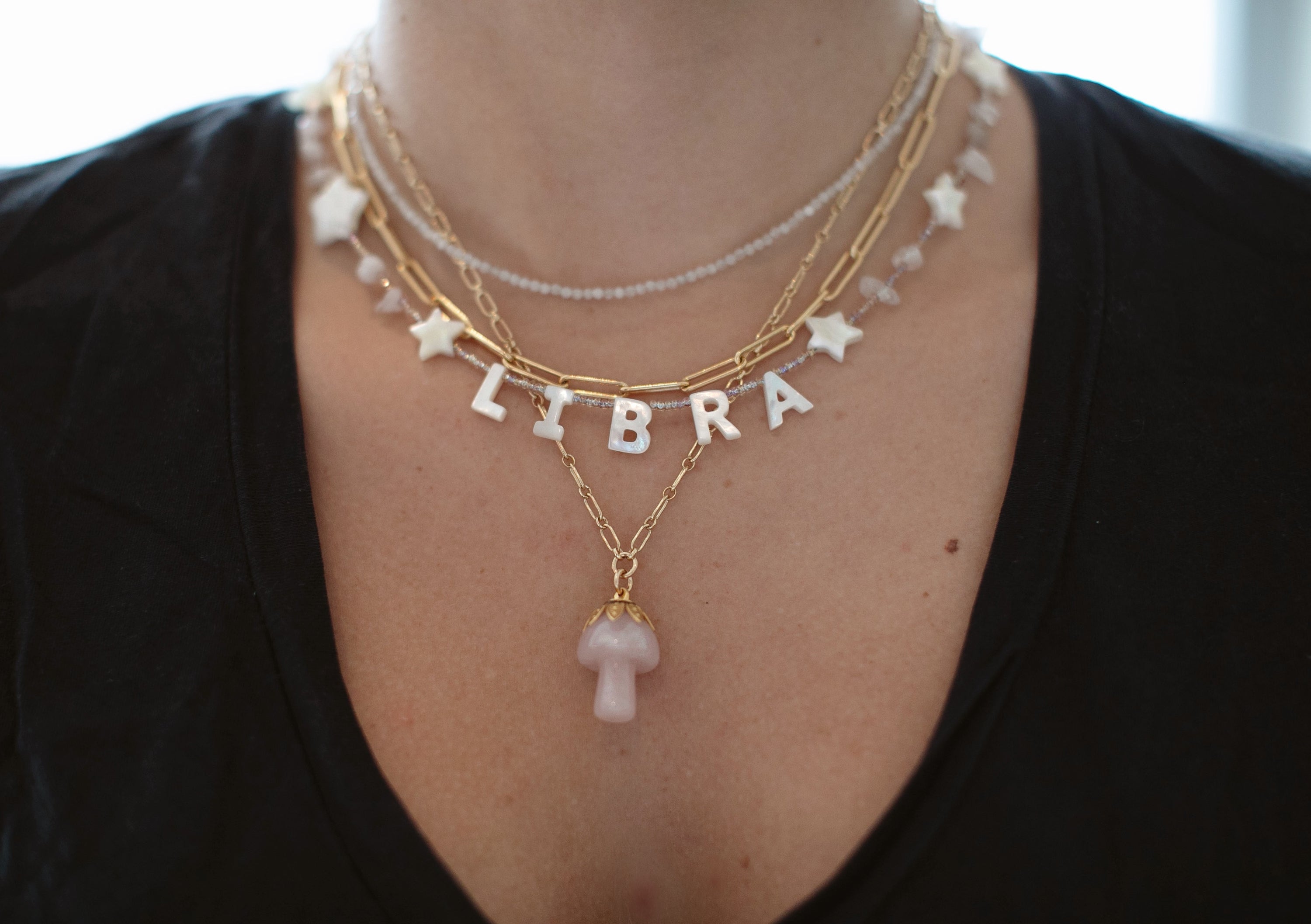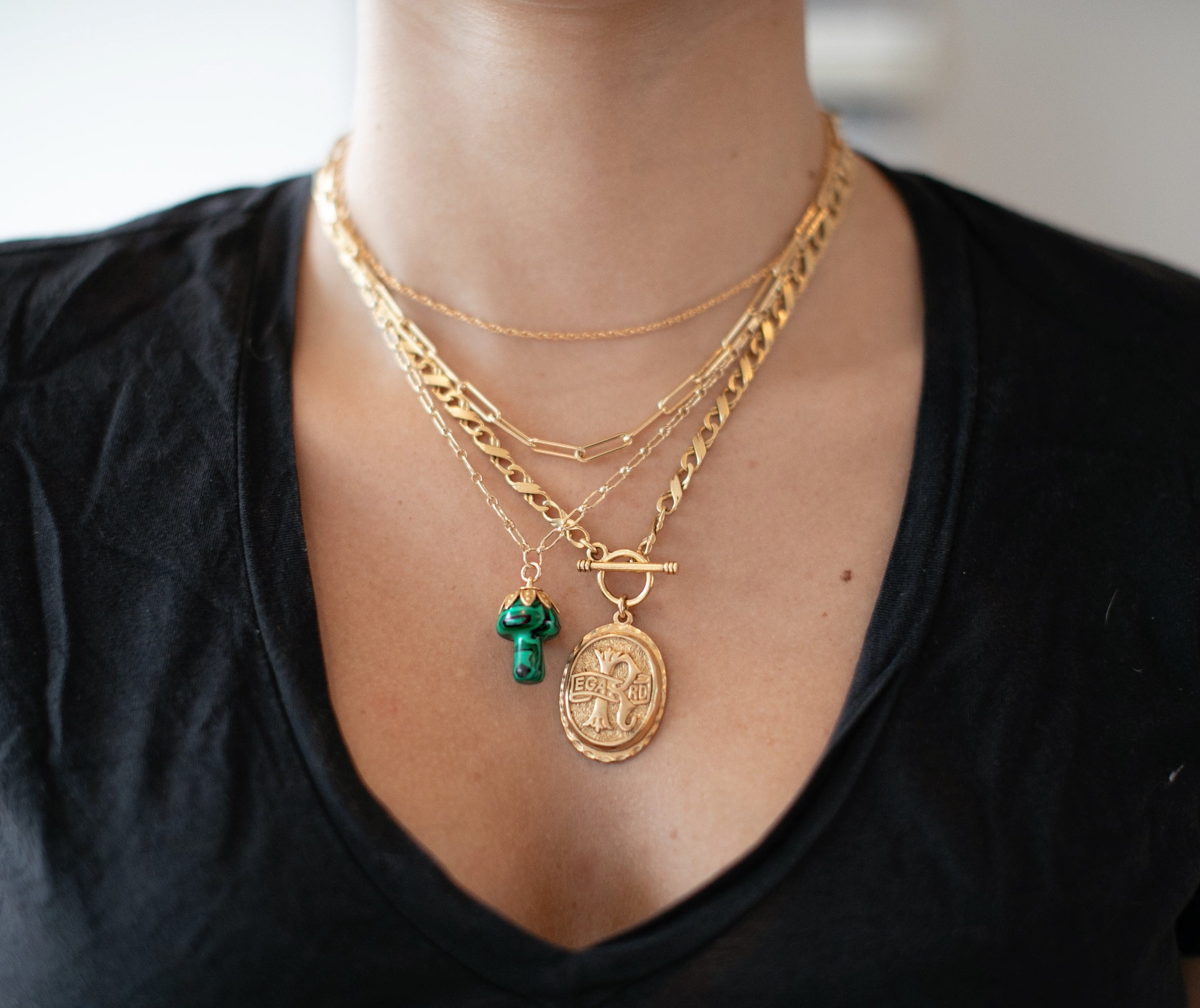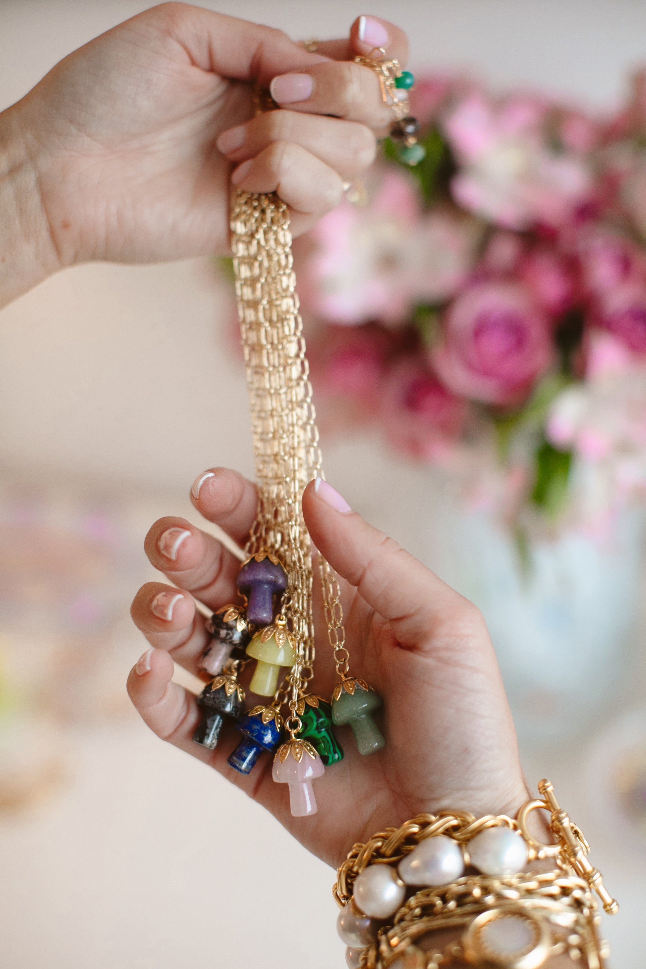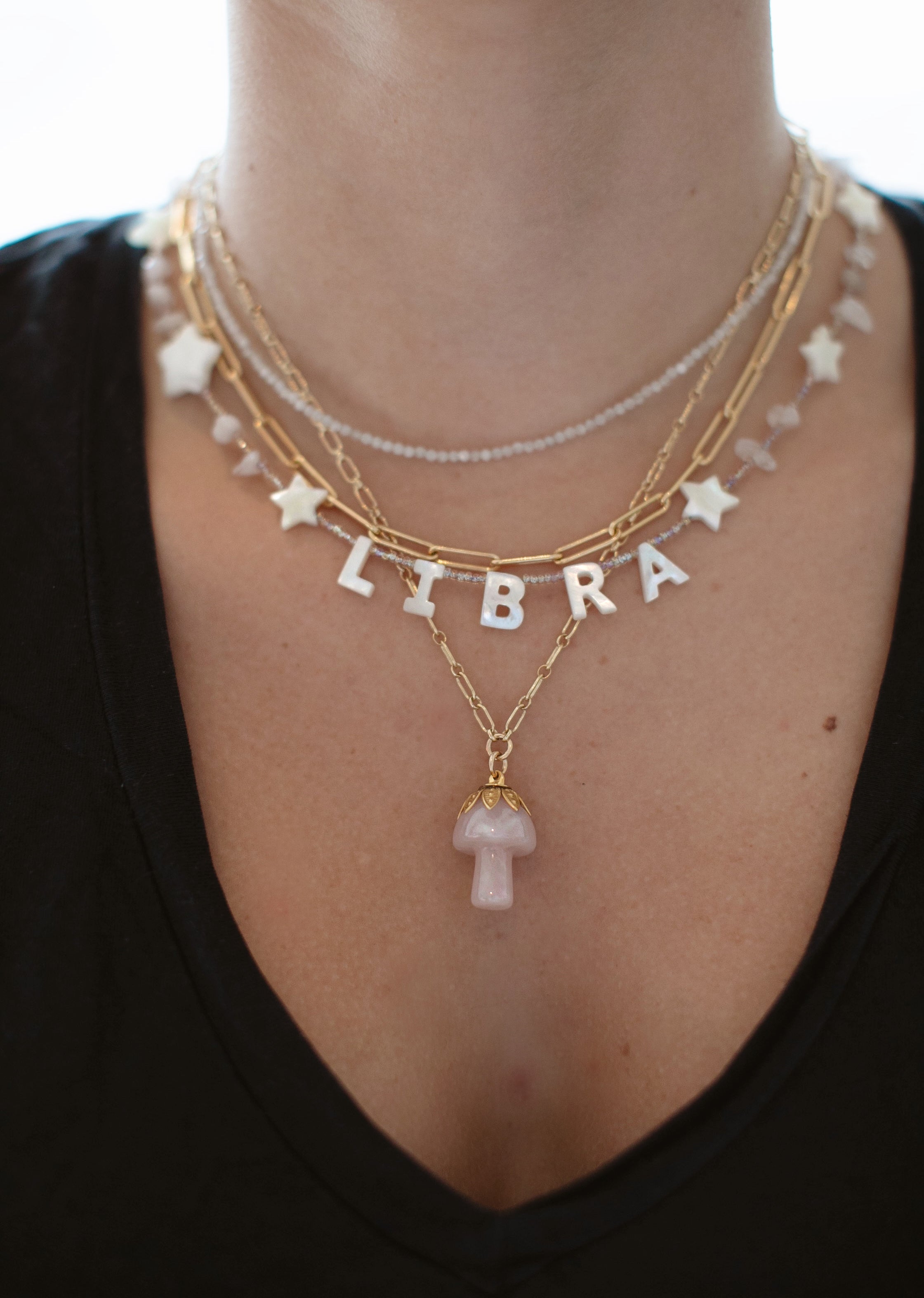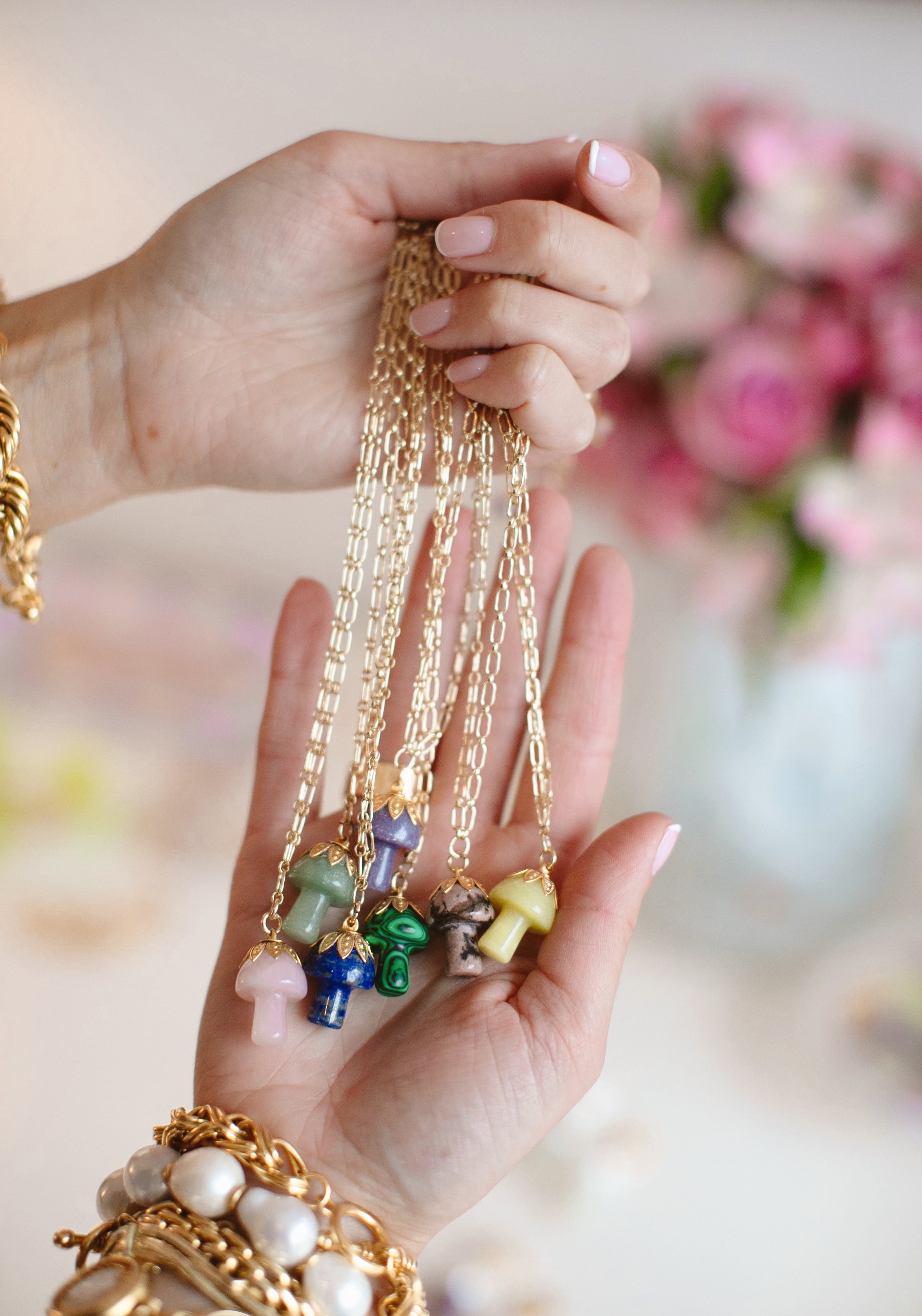 - A semi-precious stone mushroom hangs from a gold filled long & short chain