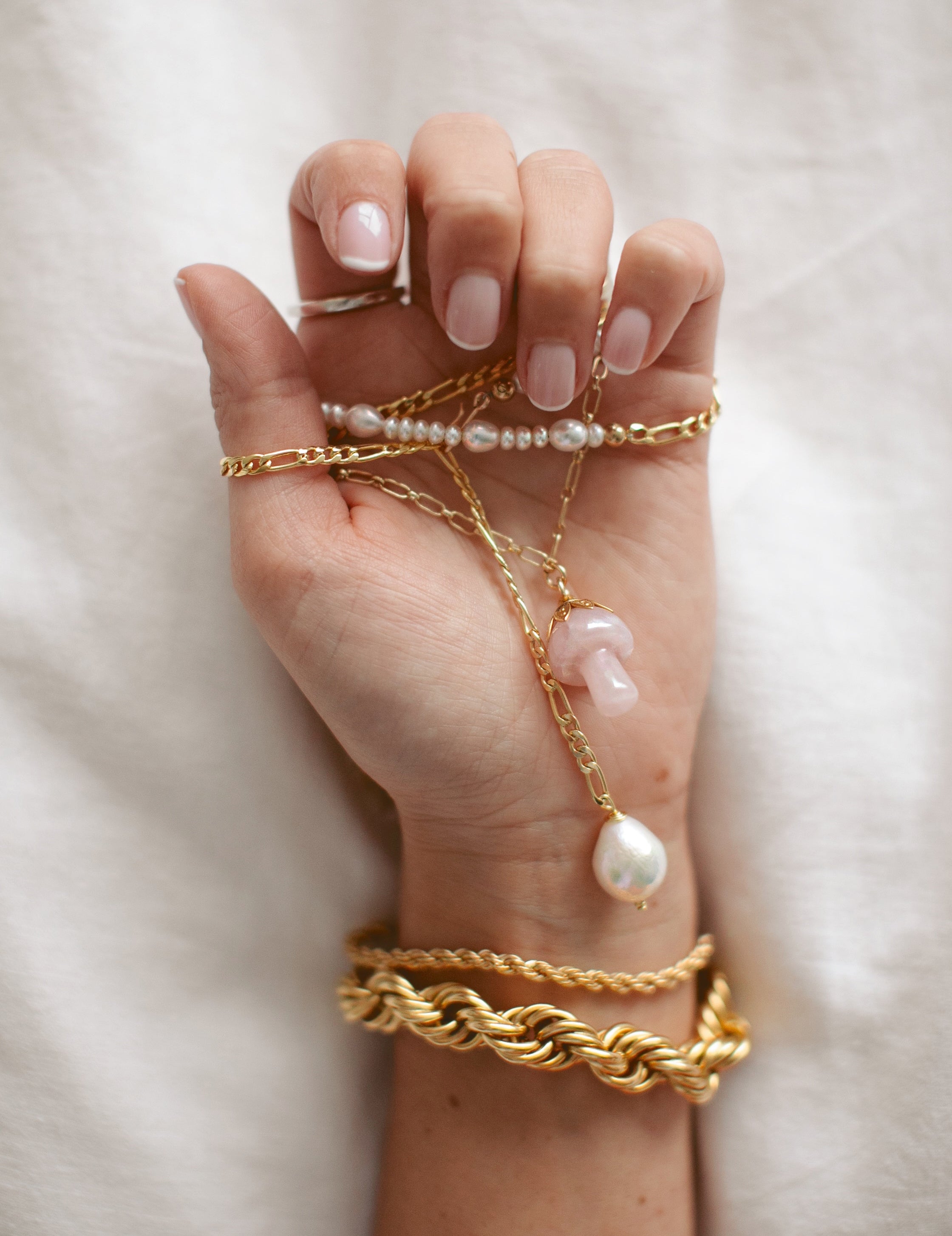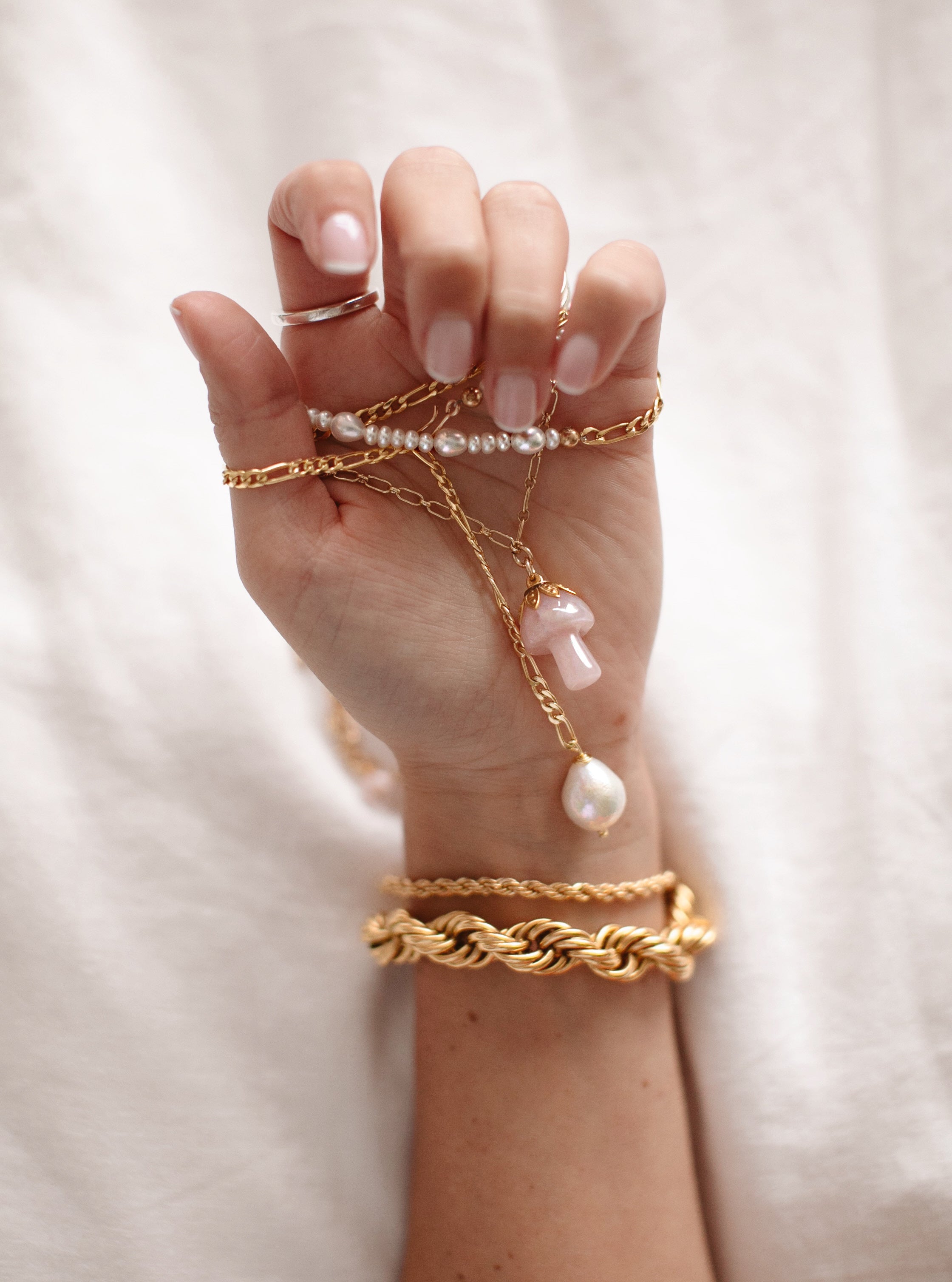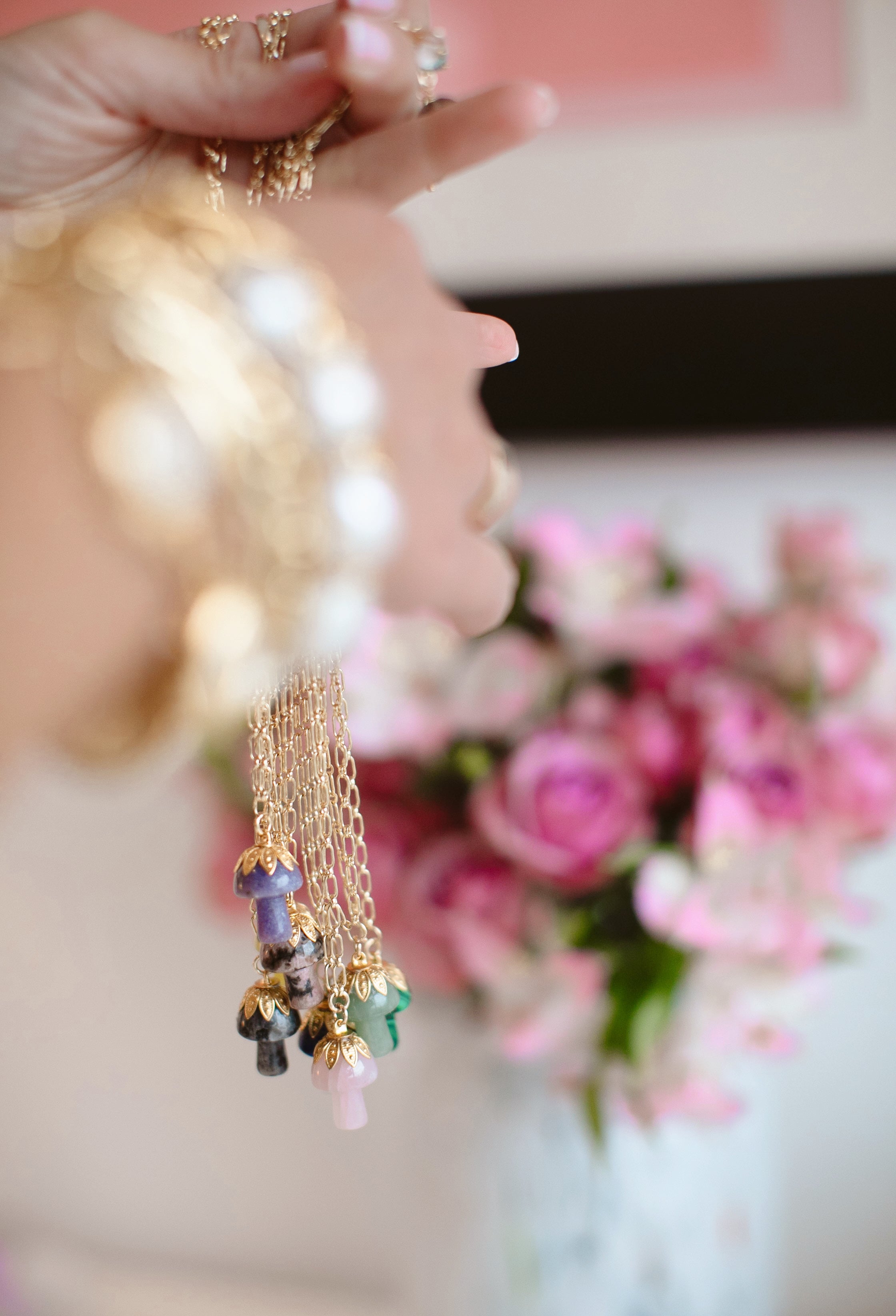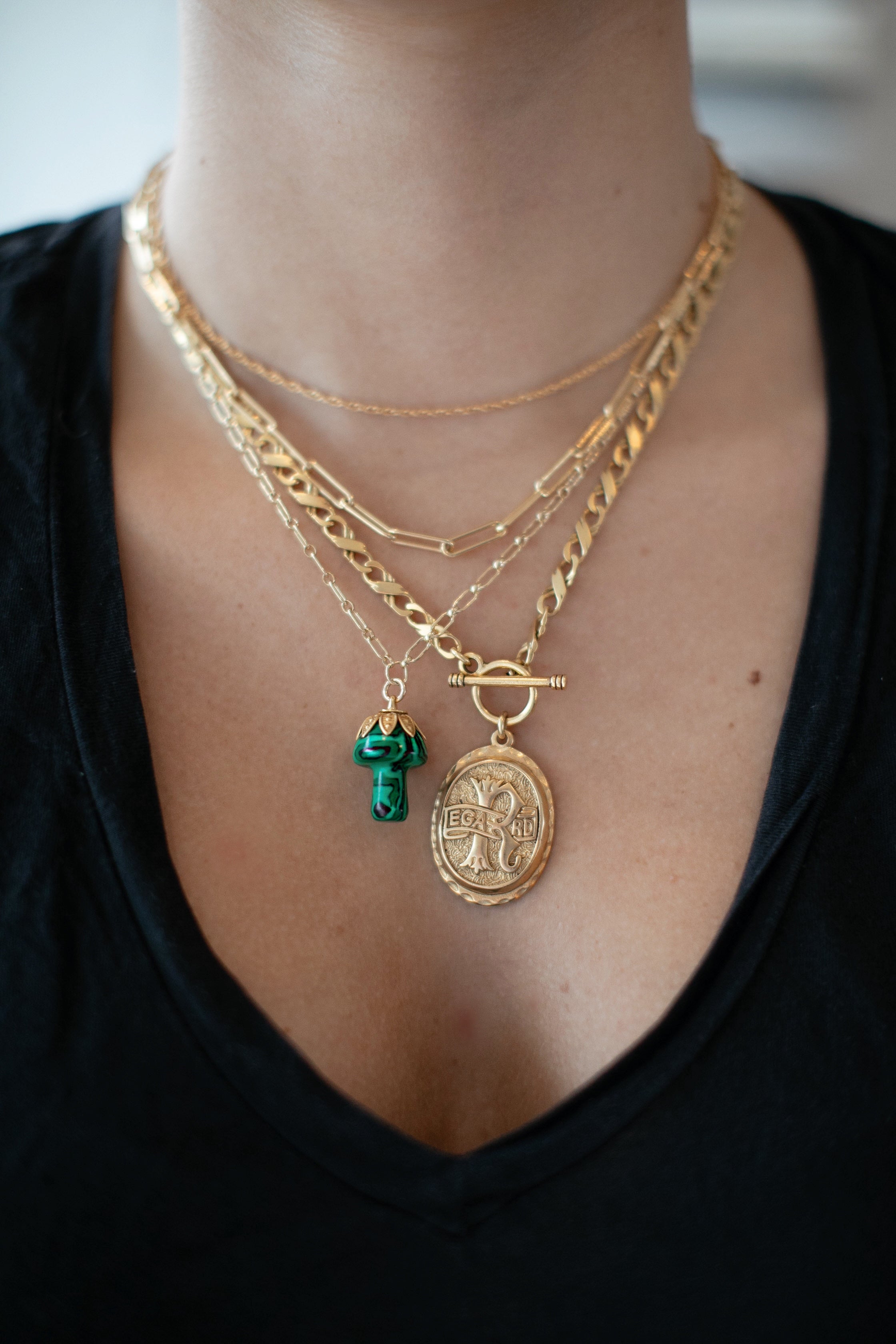 - A semi-precious stone mushroom hangs from a gold filled long & short chain