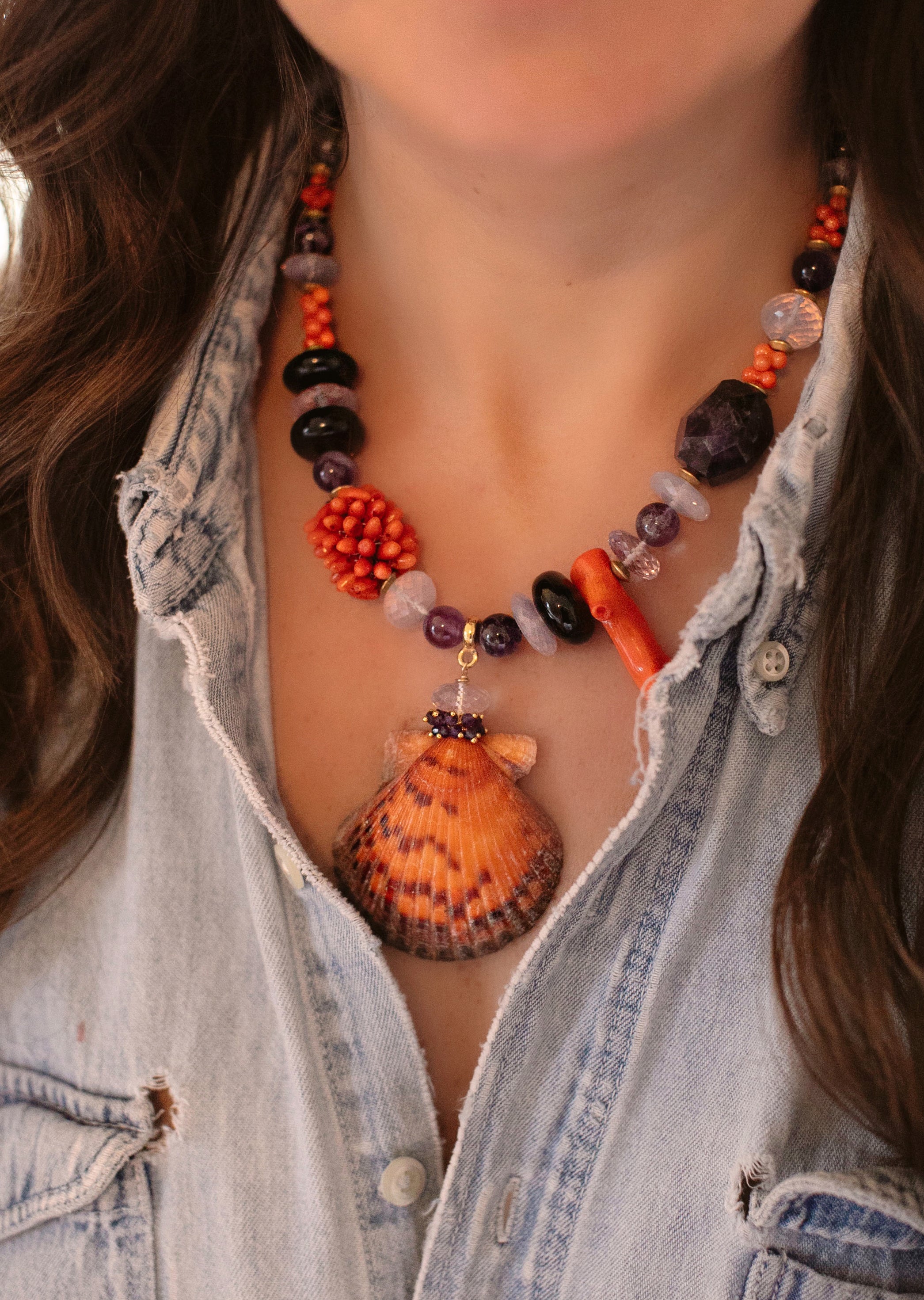 - A strand of semi-precious gemstone beads including Lavender Amethyst, Amethyst, Smoky Quartz, Coral and a raw Coral stick bead. Necklace is adorned with an Orange Pectin shell