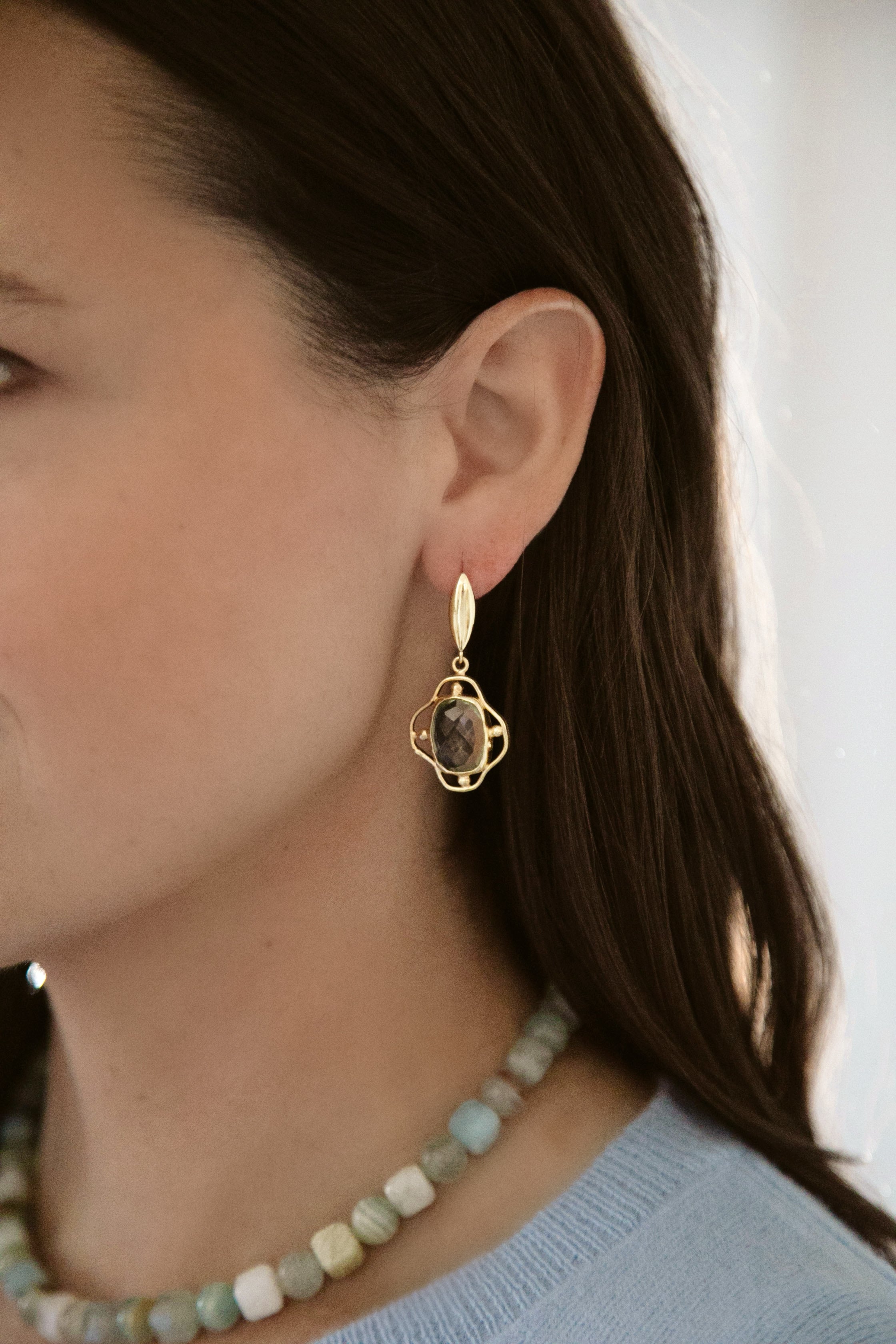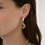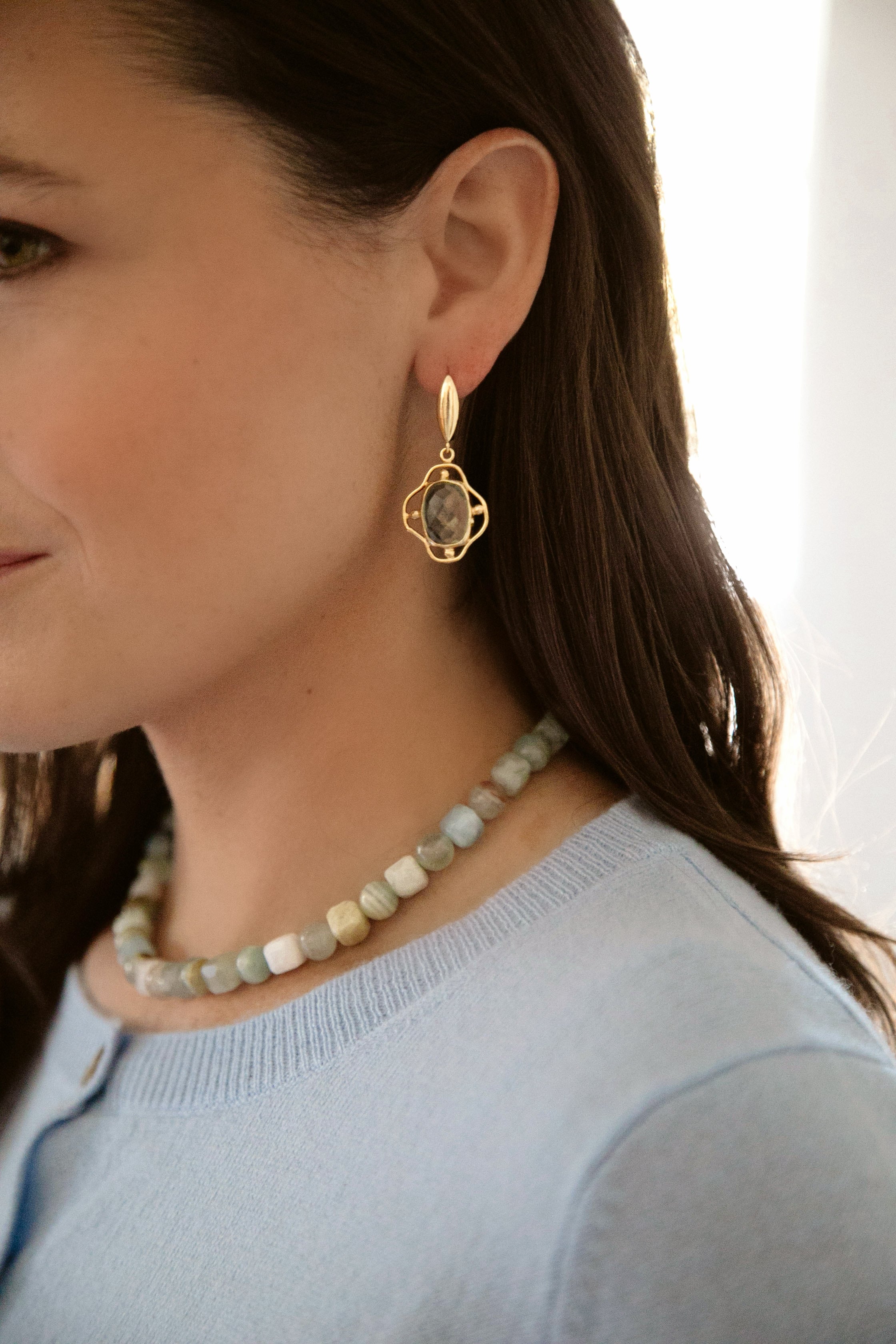 - 24k antique gold plated filigree clovers set with aquamarine quartz cabochons which hang from hypoallergenic click hoops