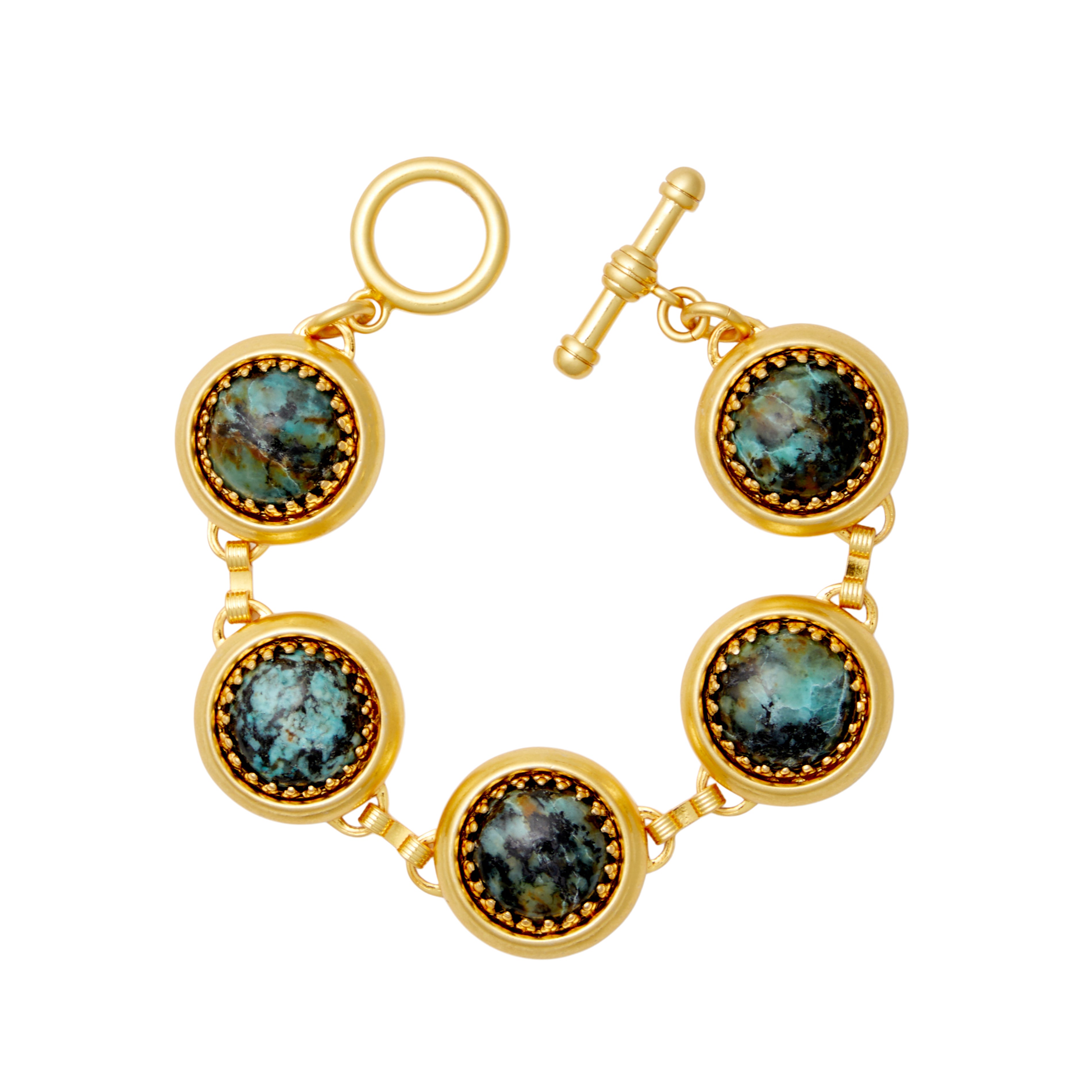- African Turquoise cabochons are set on 24k antique gold plated brass settings