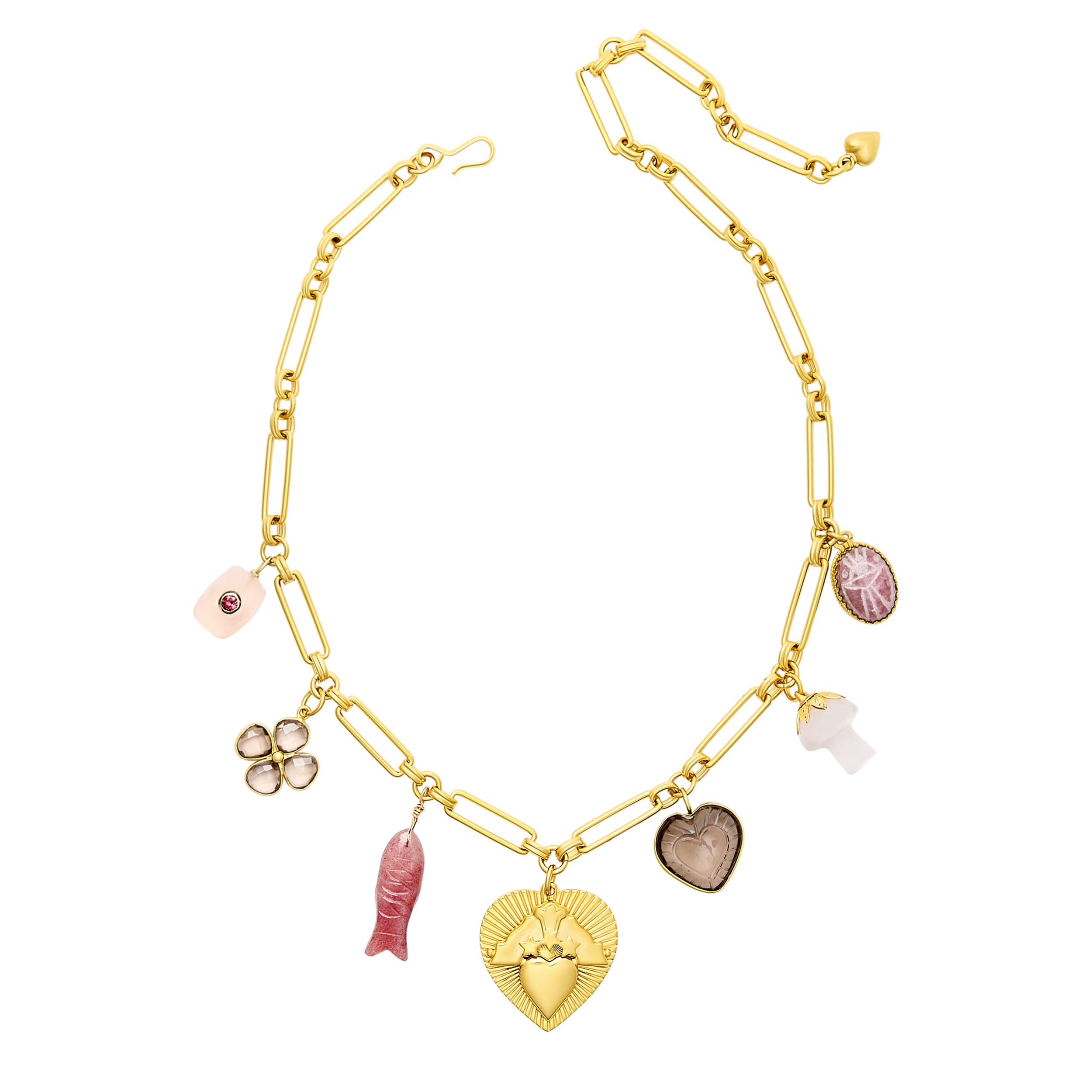 - 24k antique gold plated brass chain featuring a favorite assortment of semi-precious stone and 24k antique gold plated charms